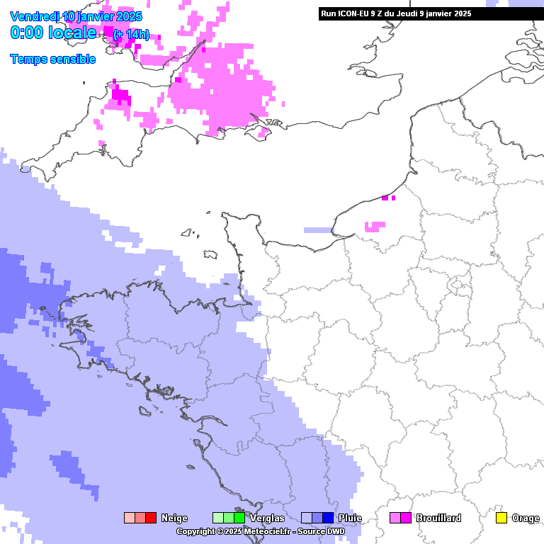 Précipitations prévues ce vendredi 9 janvier 2025, entre 00h et 16h, par le modèle ICON-EU, sur le Nord-Ouest de la France (copyright : meteociel.fr).