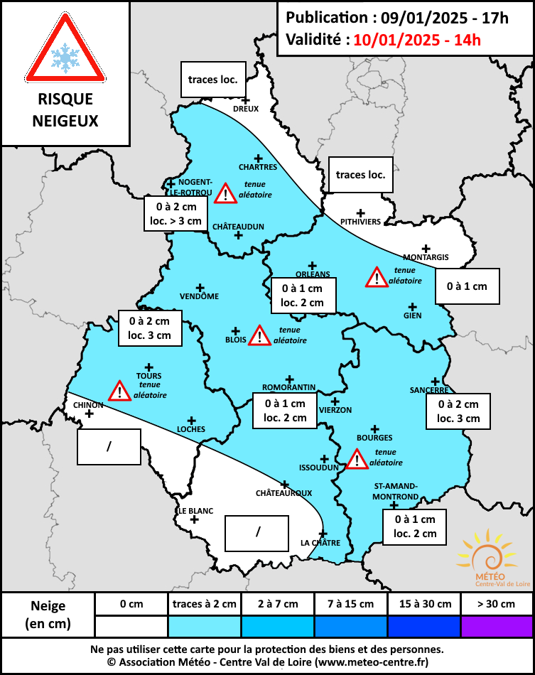 Carte risque neigeux du 10 janvier 2025 (copyright : Association Météo Centre - Val de Loire).