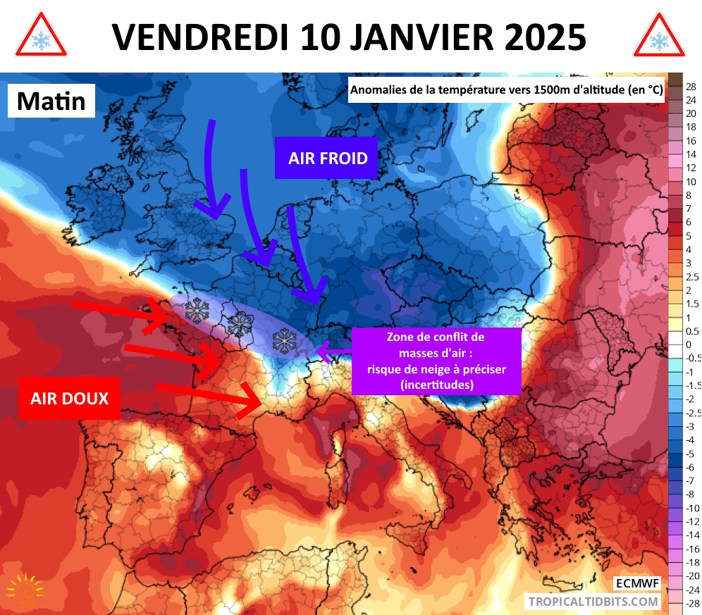 Ce vendredi 10 janvier 2025, on attendra un véritable conflit de masses d’air, entre l’air froid résistant sur le Nord de la France et l’air doux circulant sur le Sud du pays. Notre région Centre – Val de Loire se situera en plein cœur de cette zone de conflit.