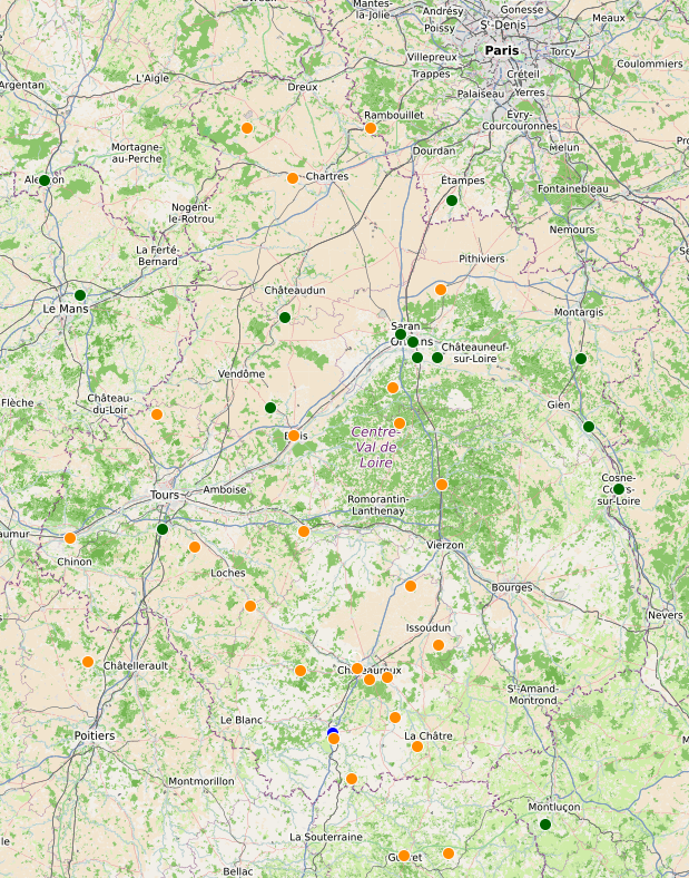 Carte des webcams de l’association, en orange les webcams météo et en bleu la première webcam crue.