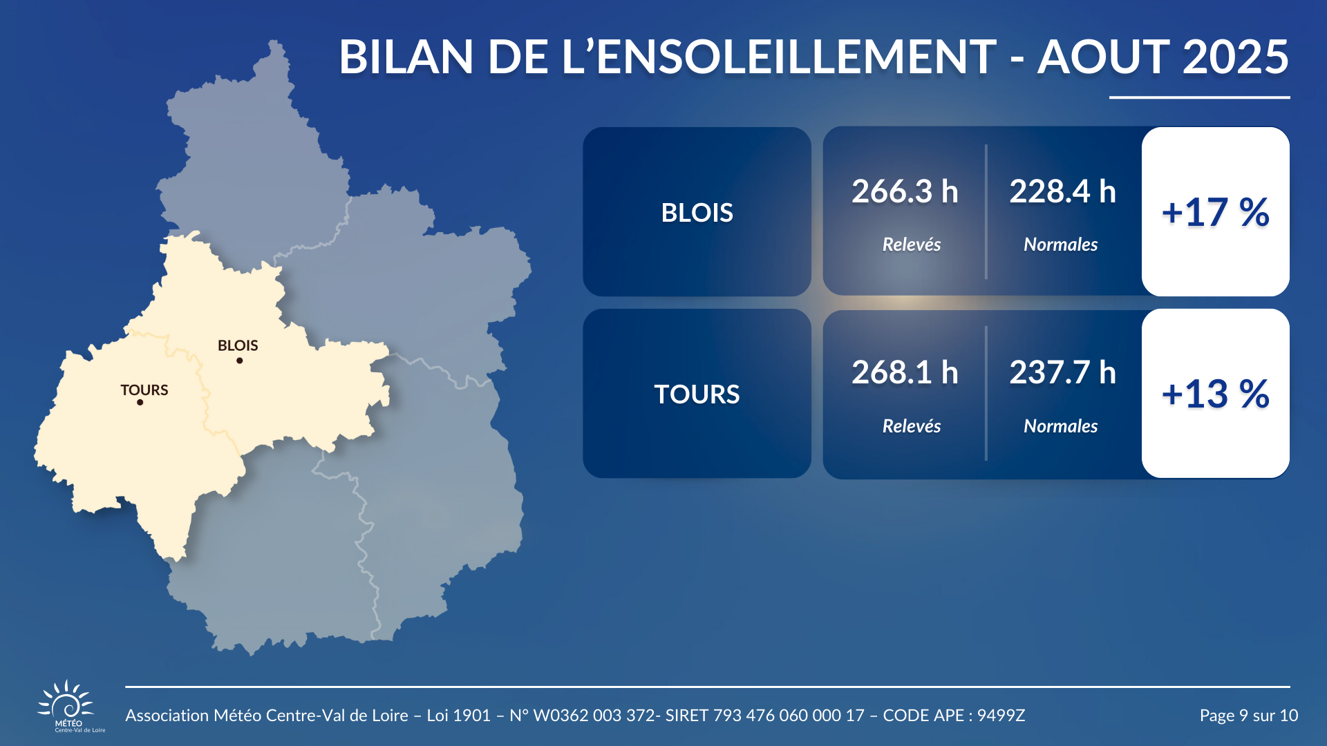 Une nouvelle fois, peu de surprise, l’ensoleillement est excédentaire sur l’ensemble de la région Centre – Val de Loire. C’est Châteaudun qui est la ville la plus ensoleillée devant Chartres et Bourges.