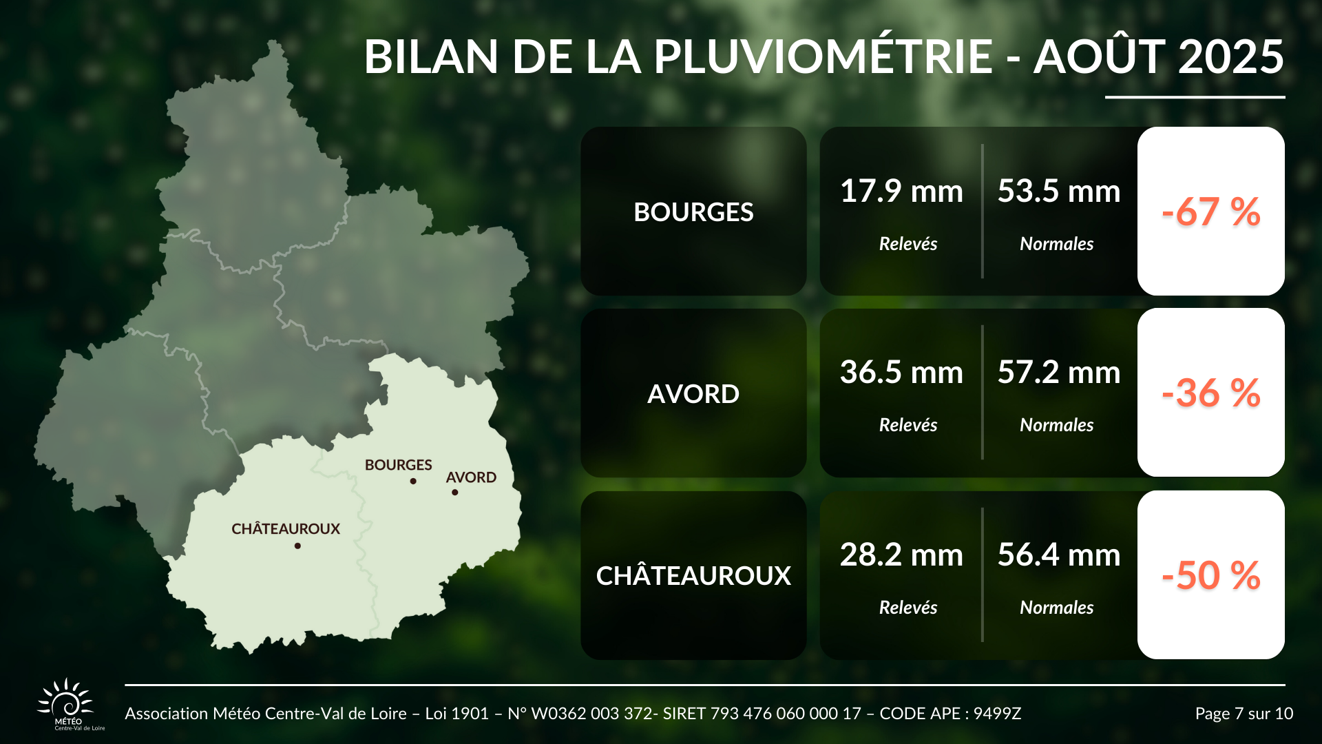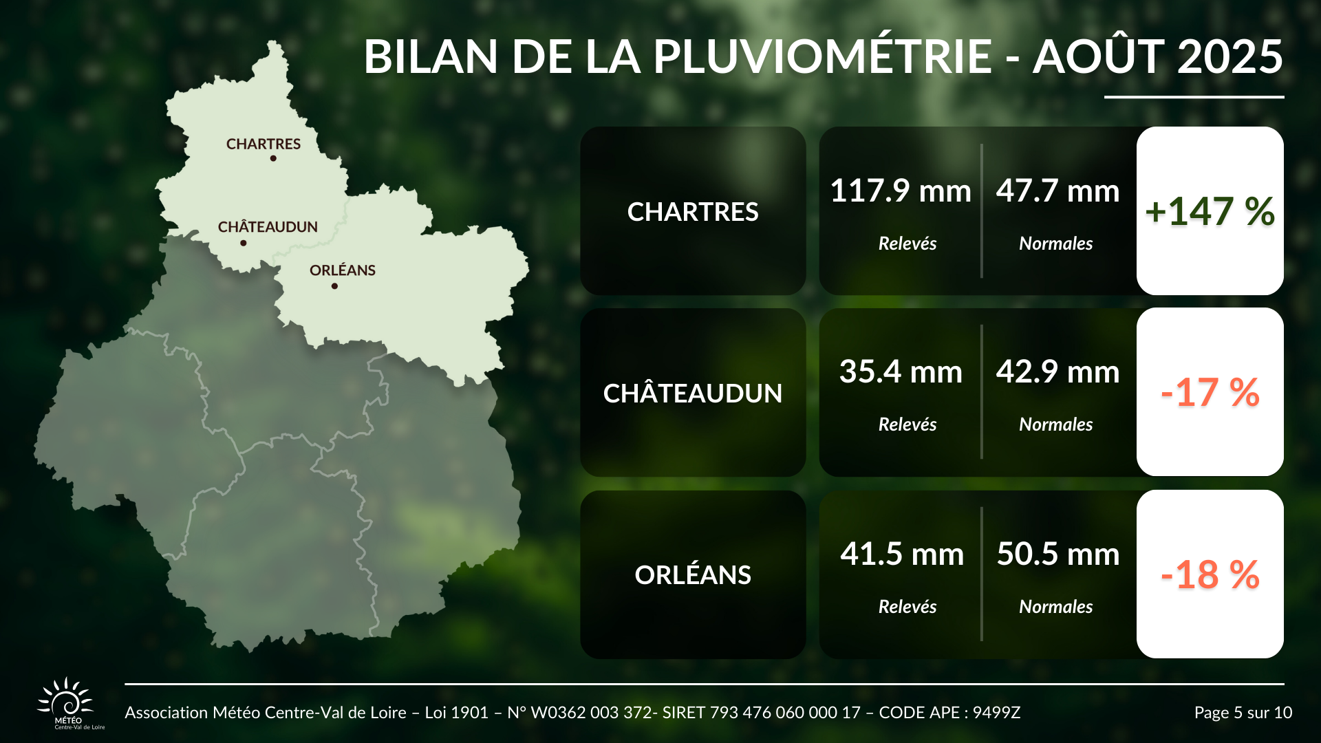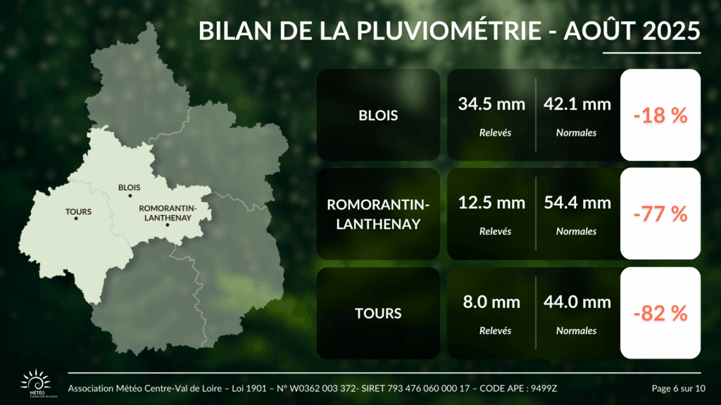 Les cumuls de plus sont déficitaires à très largement déficitaires sur la quasi-totalité de notre région. Cependant, Chartres et une partie de l’Eure-et-Loir et du Loir-et-Cher affichent des cumuls proches des normales, voire largement supérieurs. En effet, un épisode pluvio-orageux a concerné cette zone les 19 et août dernier, des records de précipitations absolus ont été battus à cette occasion.