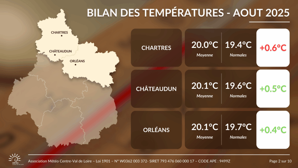 Toutes les communes étudiées dans ce bilan, à l’exception d’Orléans et de Châteaudun, présentent des températures moyennes supérieures aux normales.