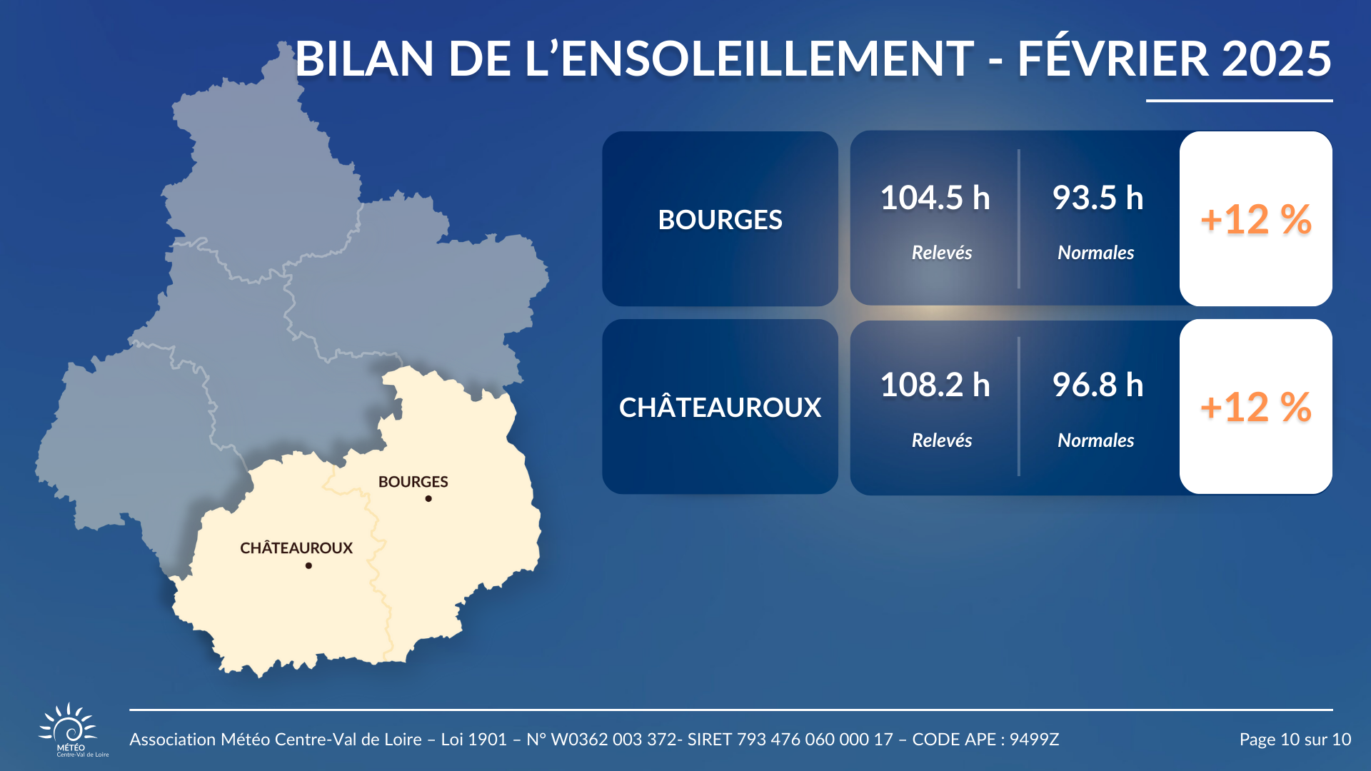 Côté ensoleillement, on observe l’inverse de la pluviométrie avec moins de soleil à l’ouest (Touraine et Blésois). Au nord, les valeurs sont dans les normes. Le Berry (et l’Orléanais) affiche un excédent de leurs côtés.