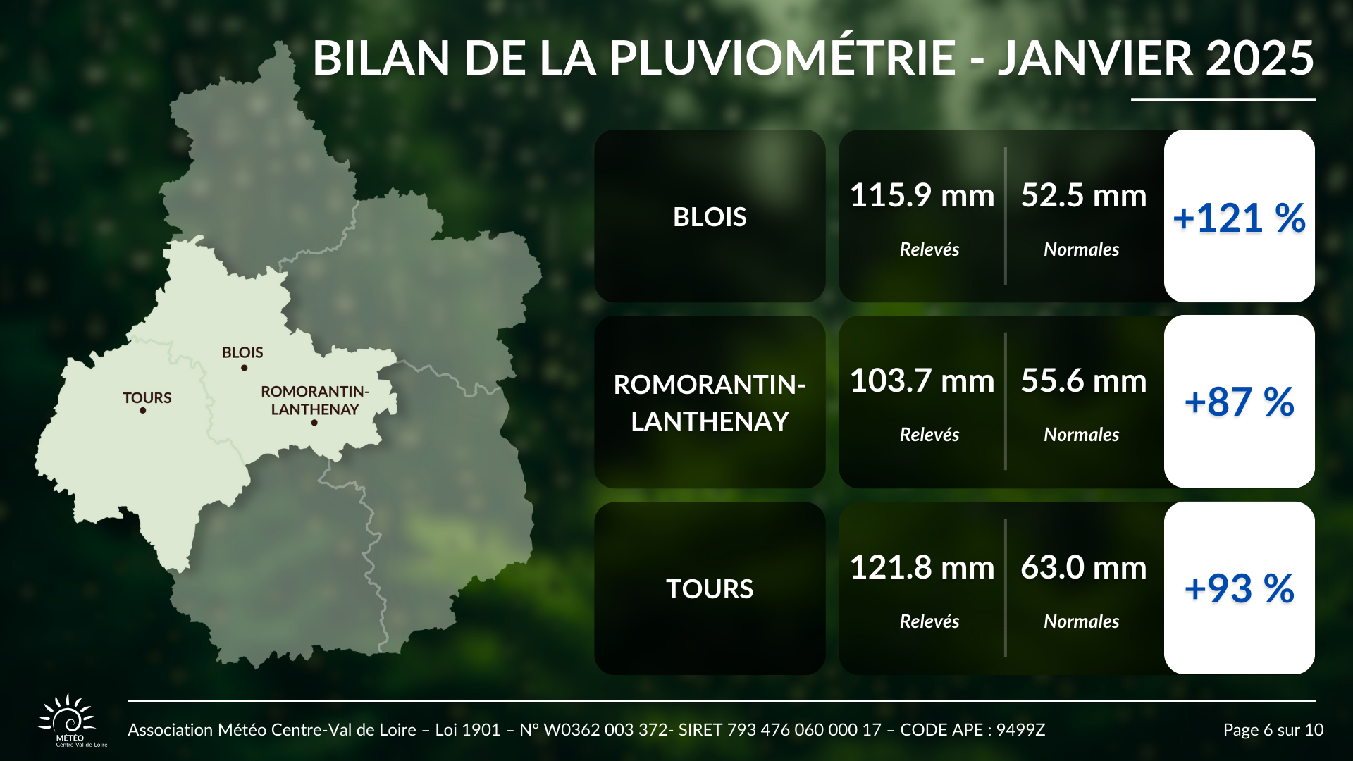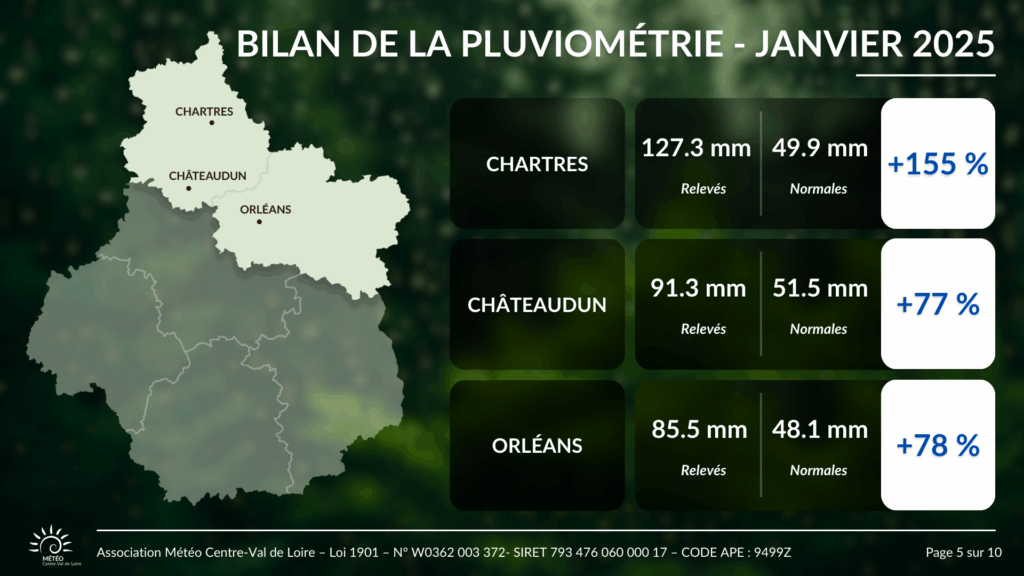 Les cumuls sont dans l’ensemble très important. Sur Blois et Chartres, la pluviométrie est très excessive même pour un mois de janvier. Seul le Haut-Berry (Cher – 18), voit des écarts aux normales plus faibles avec « seulement » 27 à 30% de surplus.