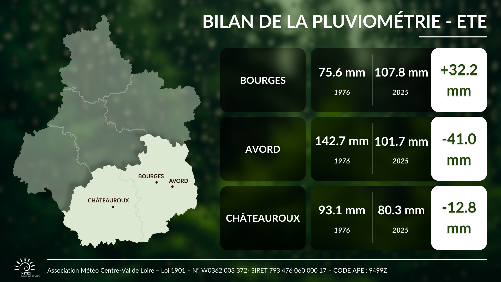 Les températures moyennes estivales sont bien plus élevées dans le Berry (Cher et Indre) avec des écarts encore plus importants Bourges et Avord par rapport à Châteauroux. Il a donc bien fait plus chaud dans cette partie de notre région cette année par rapport à 1976.