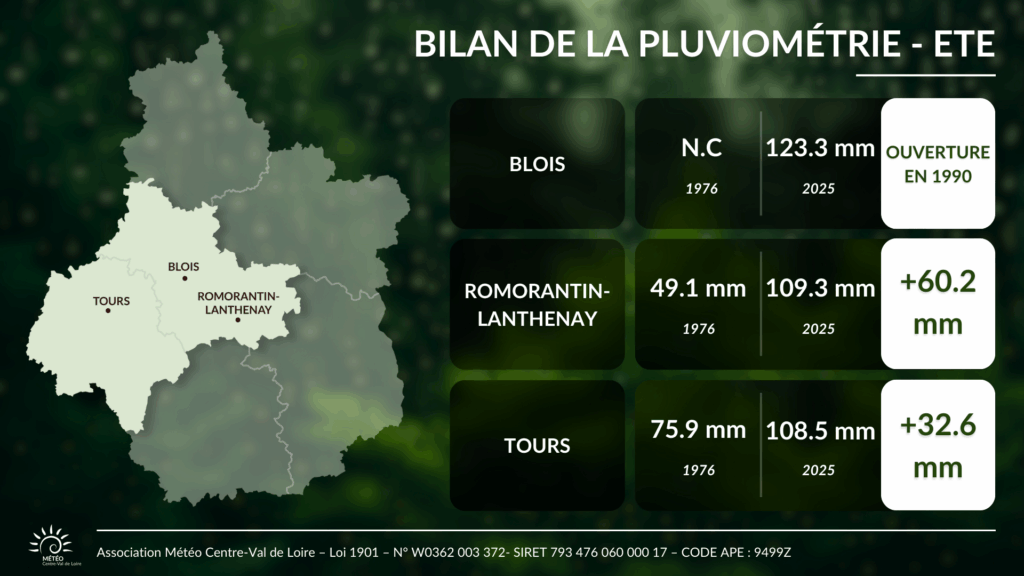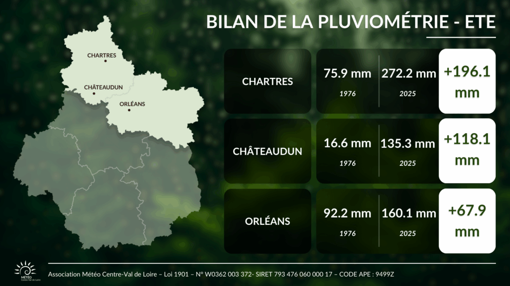 Les mois de juin, juillet et août sont en moyenne plus chauds que leurs homologues de 1976 dans la région Centre – Val (à l’exception de Châteaudun). Hormis le Berry (Indre et Cher) où il aura fait plus chaud et plus sec qu’en 76, l’humidité est bien plus présente sur le reste de notre territoire.