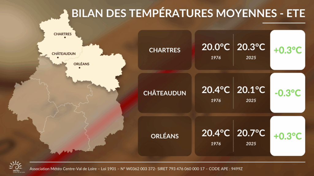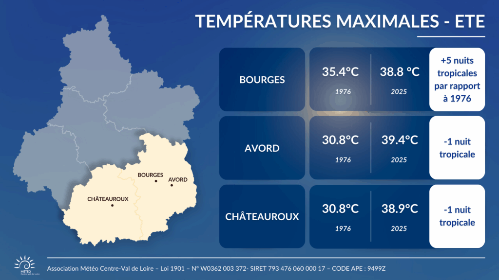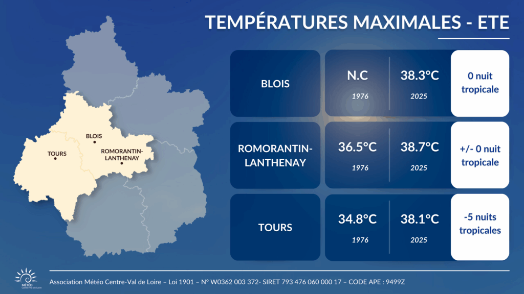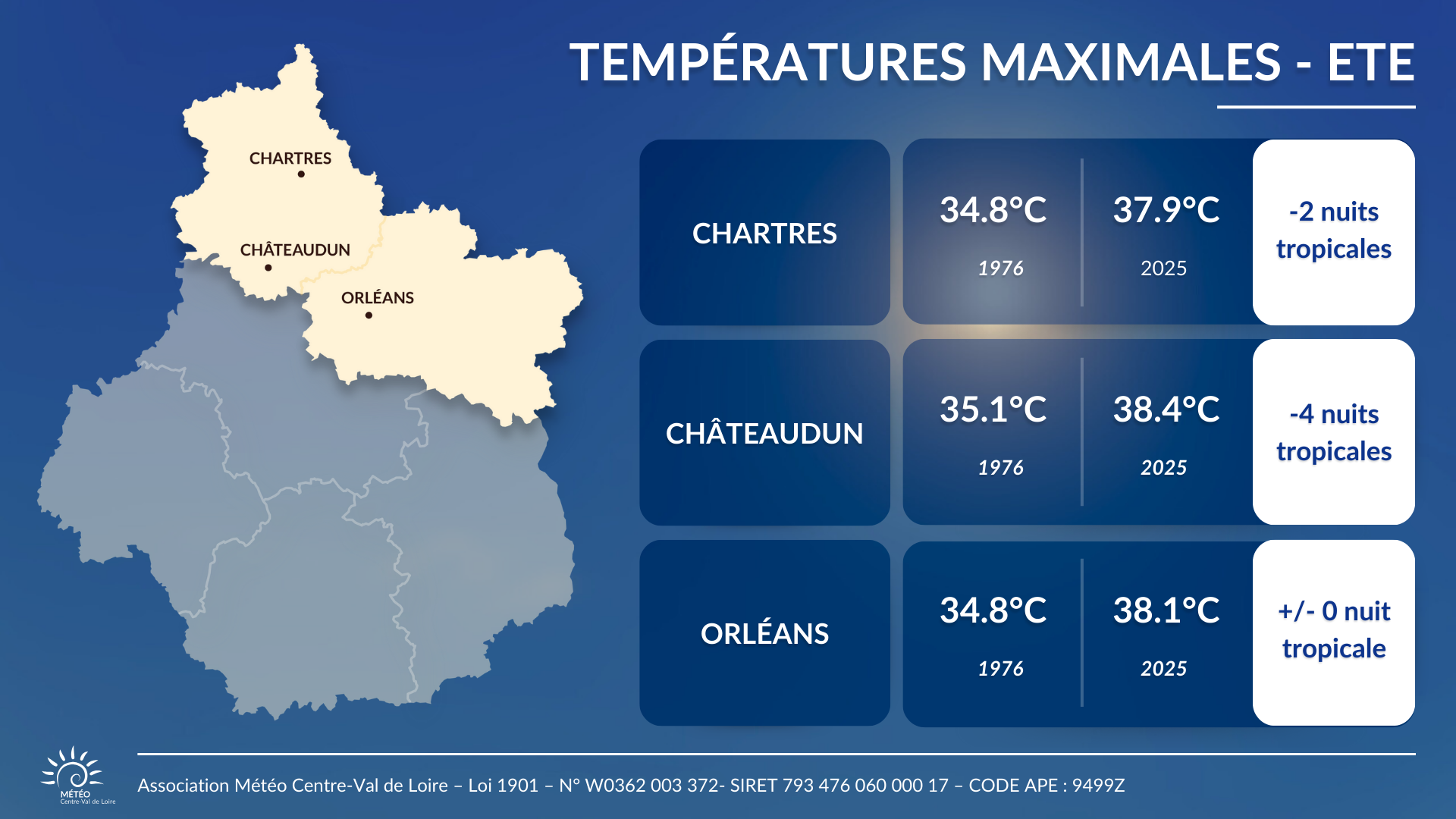 Les valeurs maximales sont très supérieures sur l’ensemble de la région Centre – Val de Loire. La valeur maximale pour ces communes était au maximum de 36.5°C à Romorantin en 1976. La valeur la plus basse des maxima de l’été 2025 est de 37.9°C à Chartres.