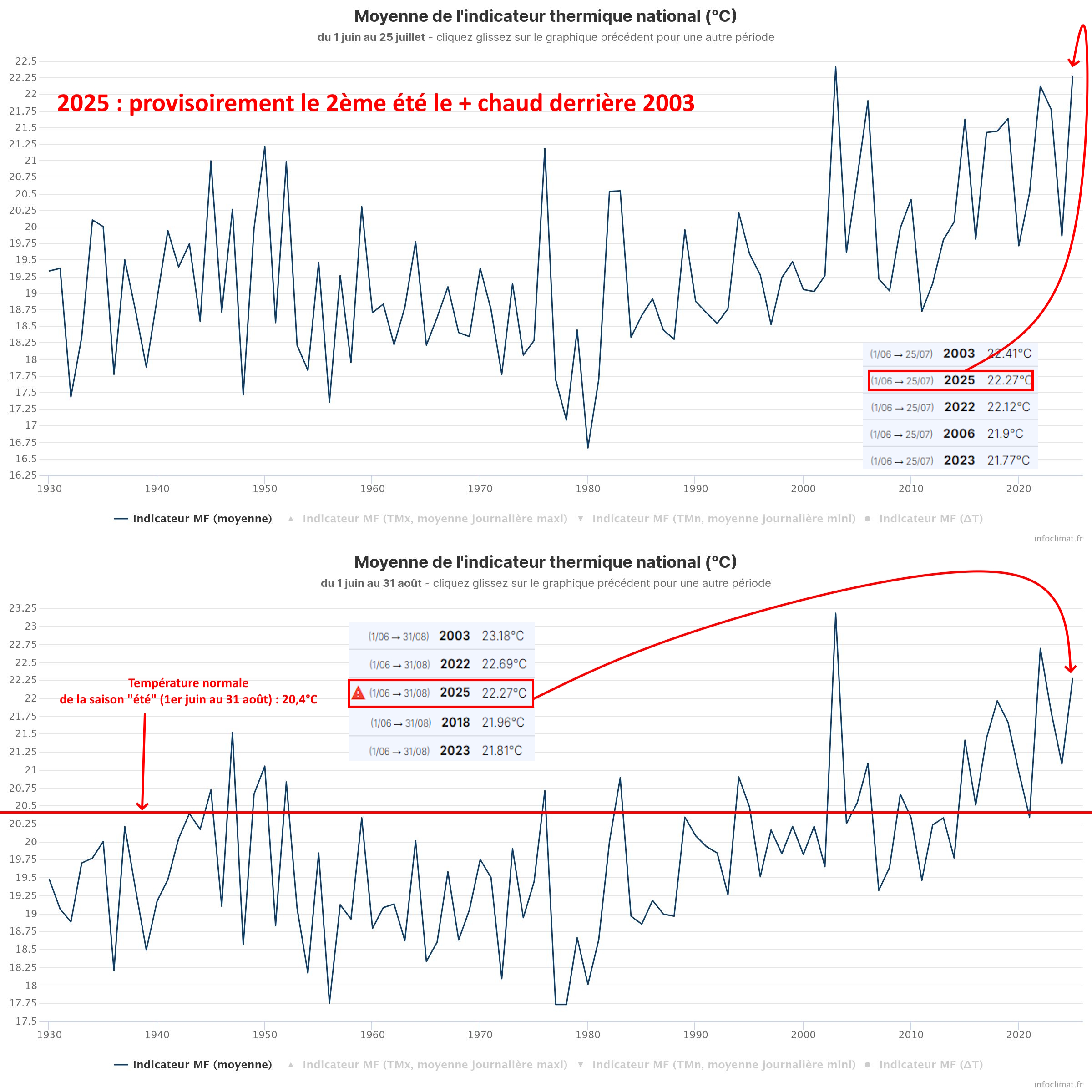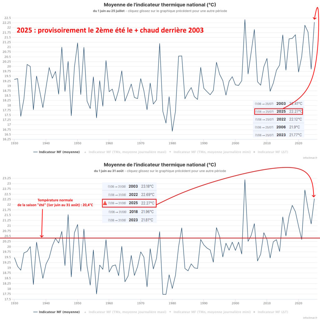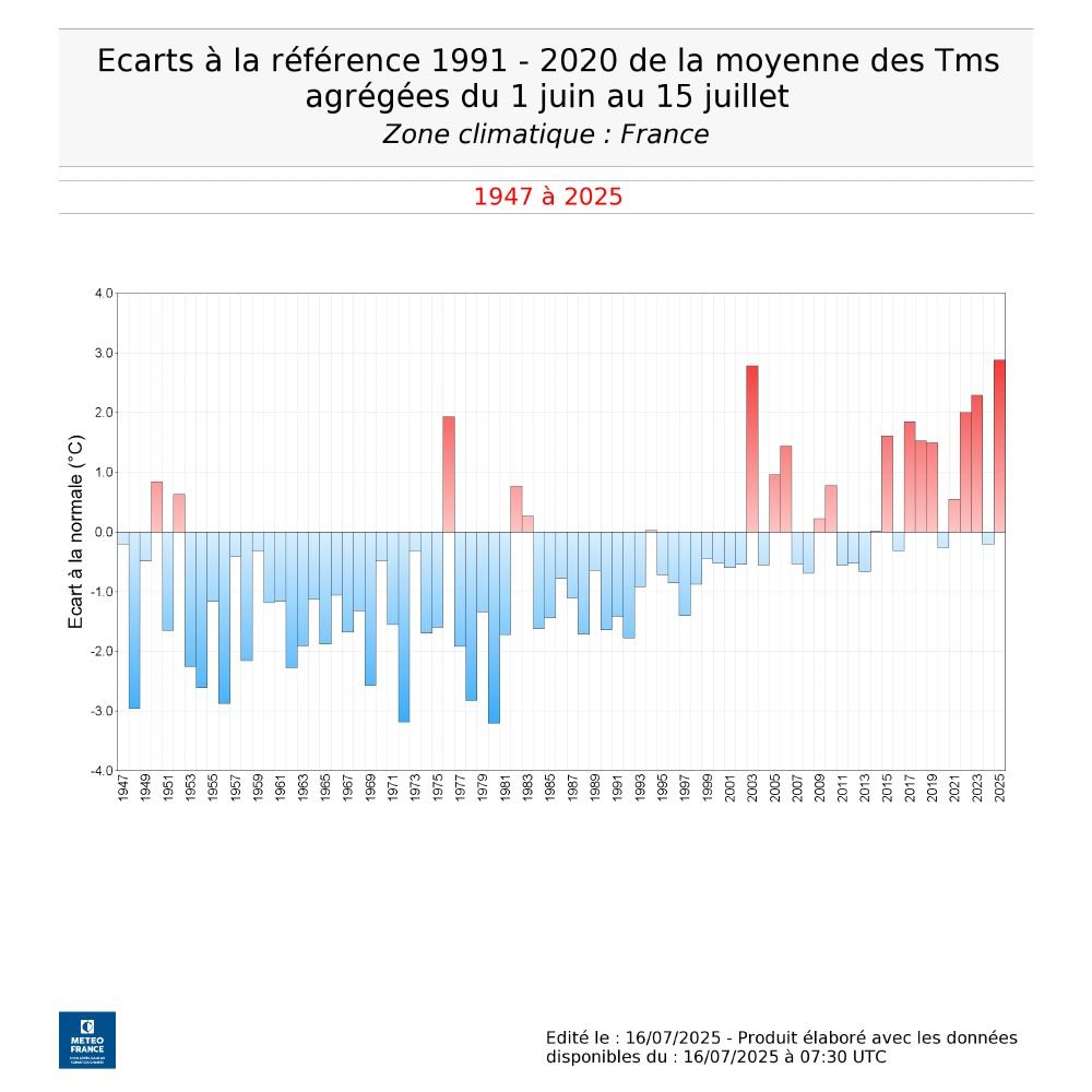 Même constat au niveau national, ce début d’été 2025 est le plus chaud depuis le début des relevés ! Seule différence, d’après Météo France, le top 5 est le suivant (indicateur thermique national du 1er juin au 15 juillet)  :