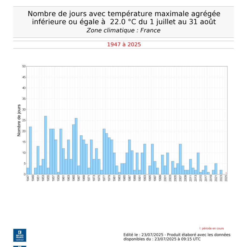 Nombre de jours avec température maximale agrégée inférieure ou égale à 22°C du 1er juillet au 31 août (copyright : Météo France).