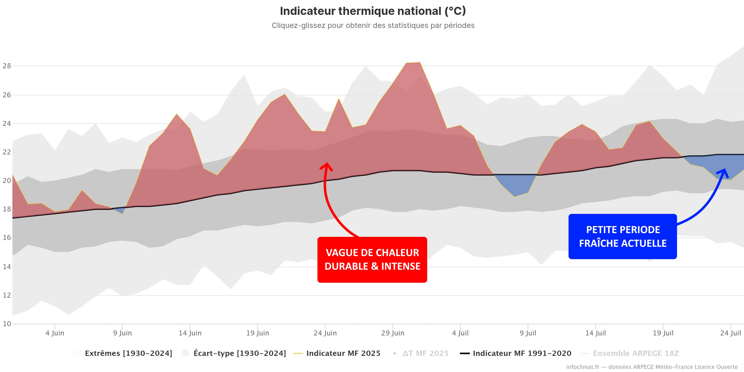 Evolution de l’indicateur thermique national du 1er juin au 25 juillet 2025 (copyright : Infoclimat, graphique légendé par l’Association Météo Centre – Val de Loire pour les explications).