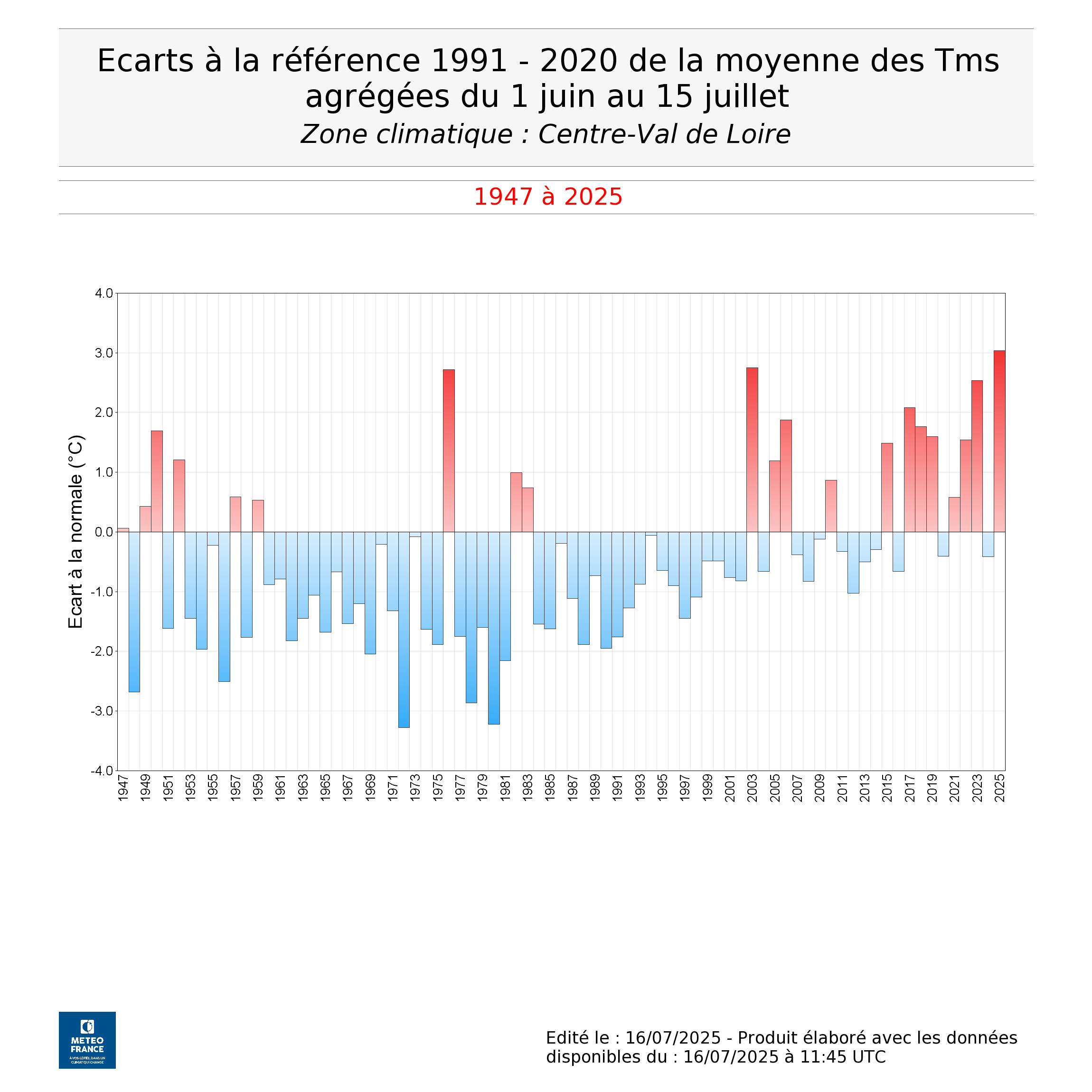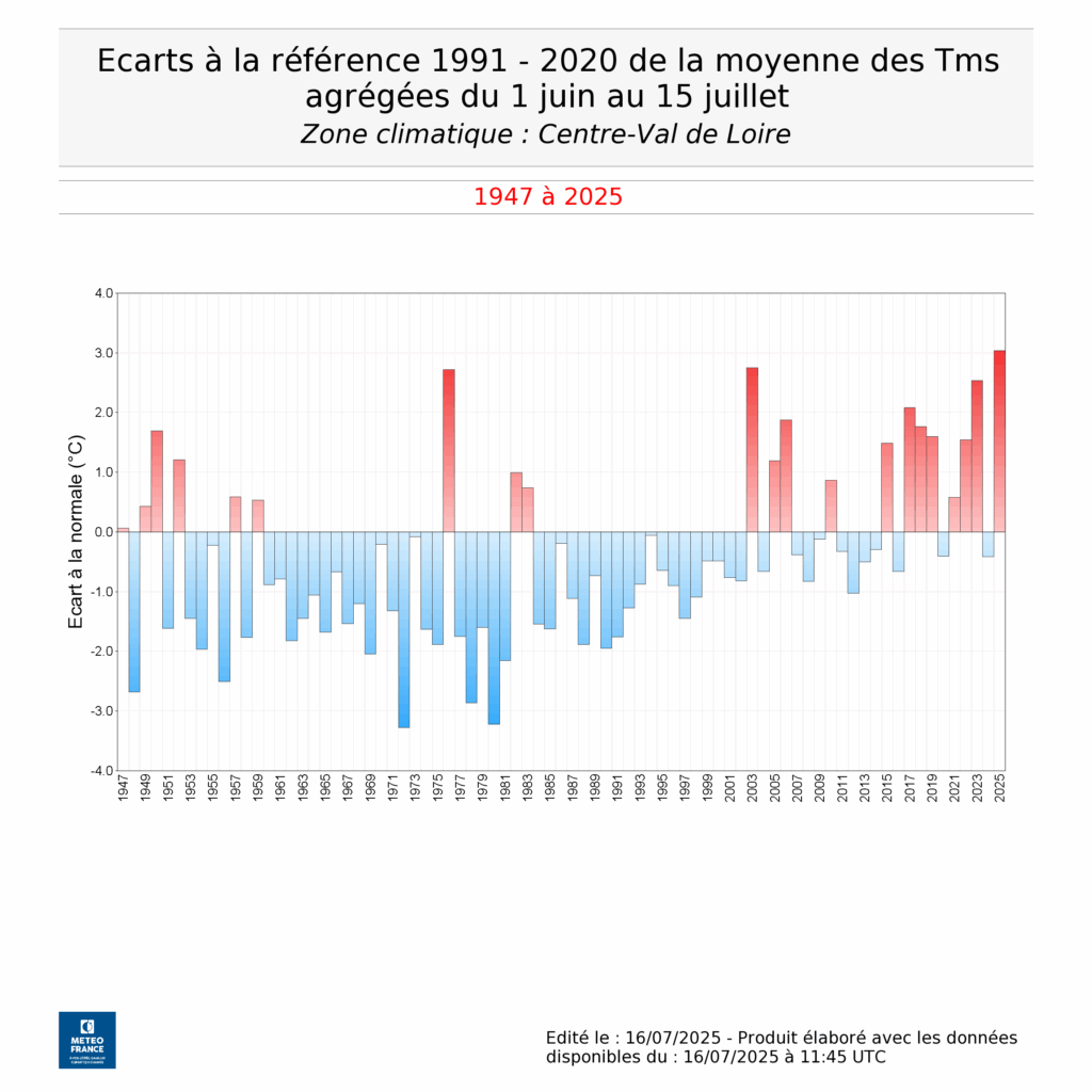 Au regard des données de Météo France, cela fait de la période du 1er juin au 15 juillet 2025 la plus chaude (sur une période équivalente) depuis le début des relevés en région Centre – Val de Loire !