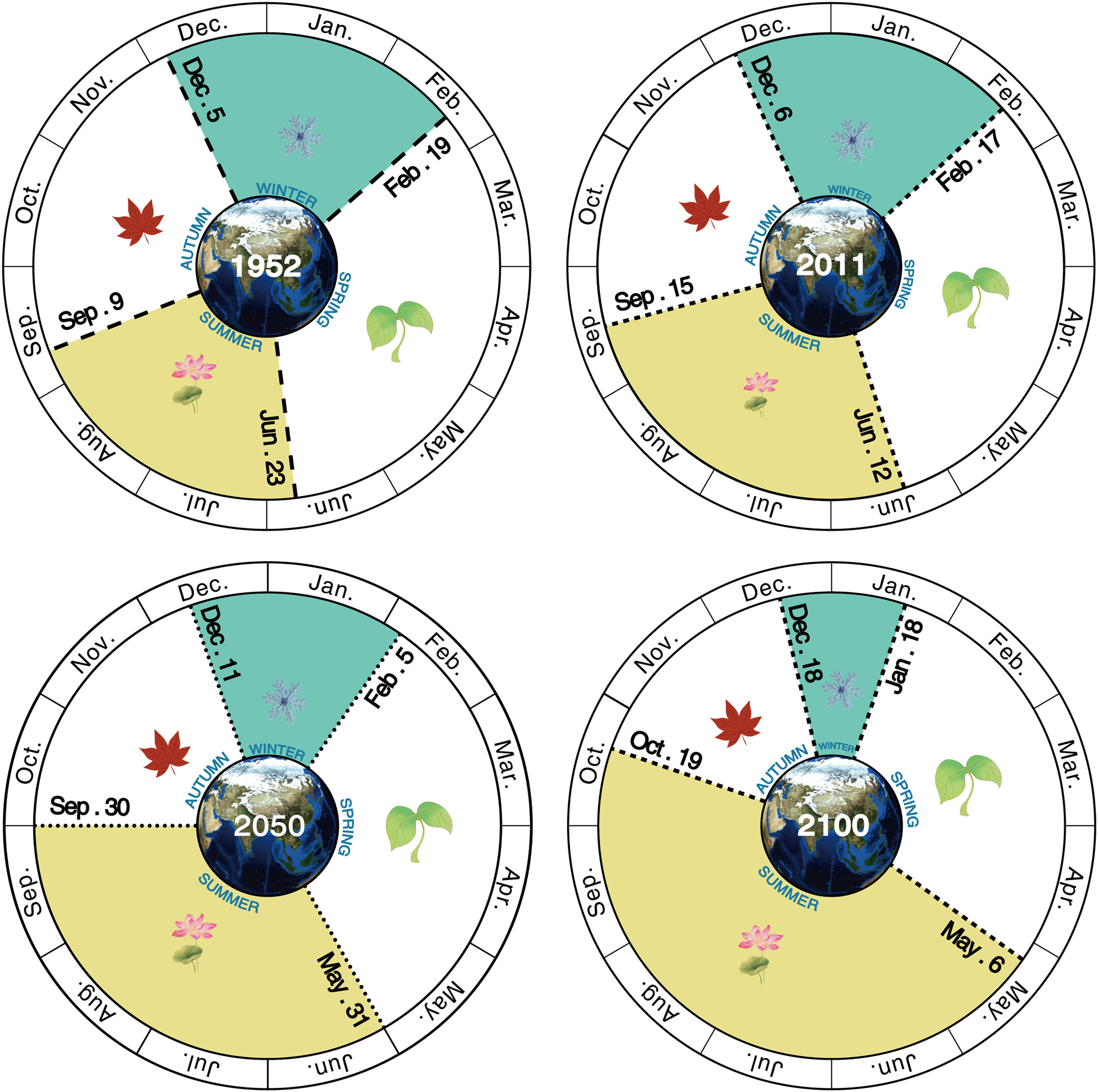 Débuts et durées des saison dans l’hémisphère Nord, aux moyennes latitudes, en 1952, 2011, 2050, et 2100 (copyright : Wang et al 2020/Geophysical Research Letters/AGU / HadGHCND, and the bottom row is from RCP8.5. HadGHCND, Hadley Centre’s Global Historical Climatology Network Daily; RCP, representative concentration pathways).