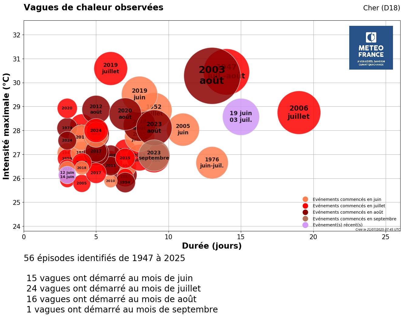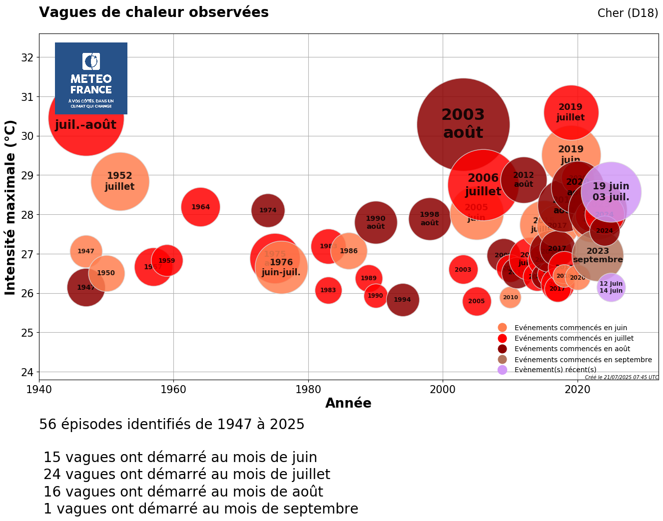 Les vagues de chaleur recensées dans le Cher depuis 1947 (copyright : Météo France).