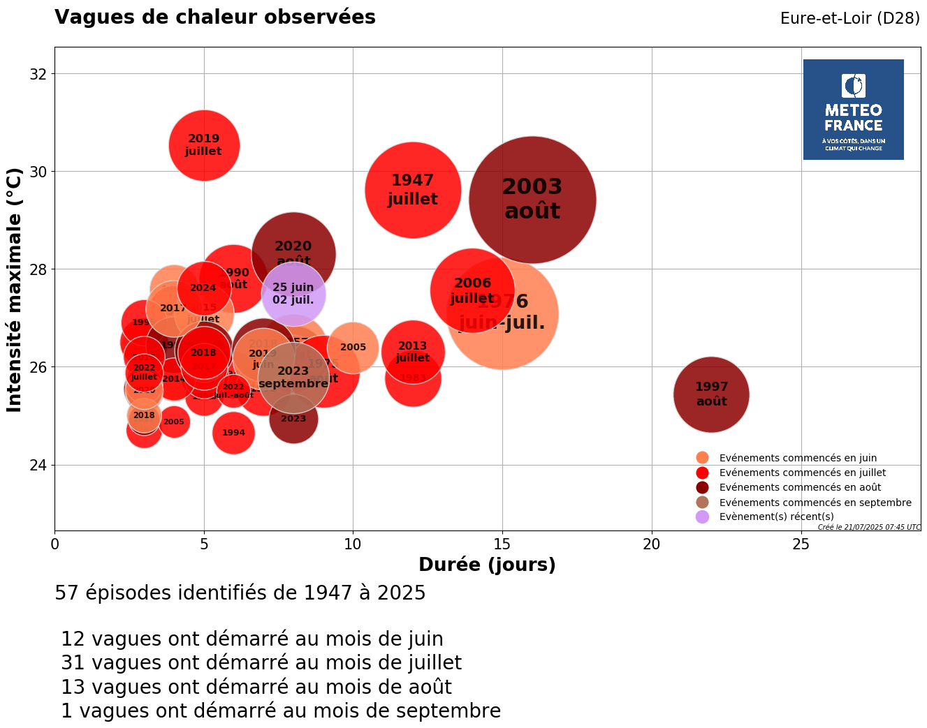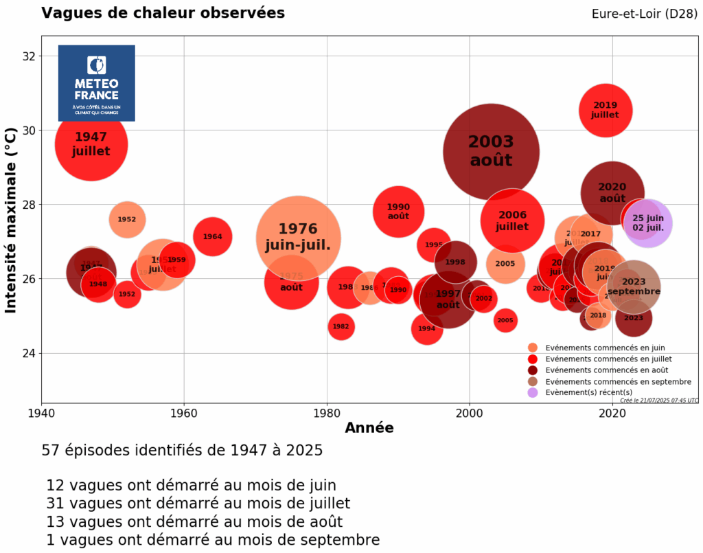 Les vagues de chaleur recensées en Eure-et-Loir depuis 1947 (copyright : Météo France).