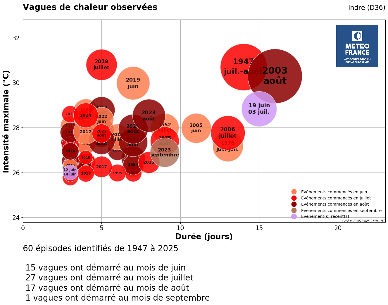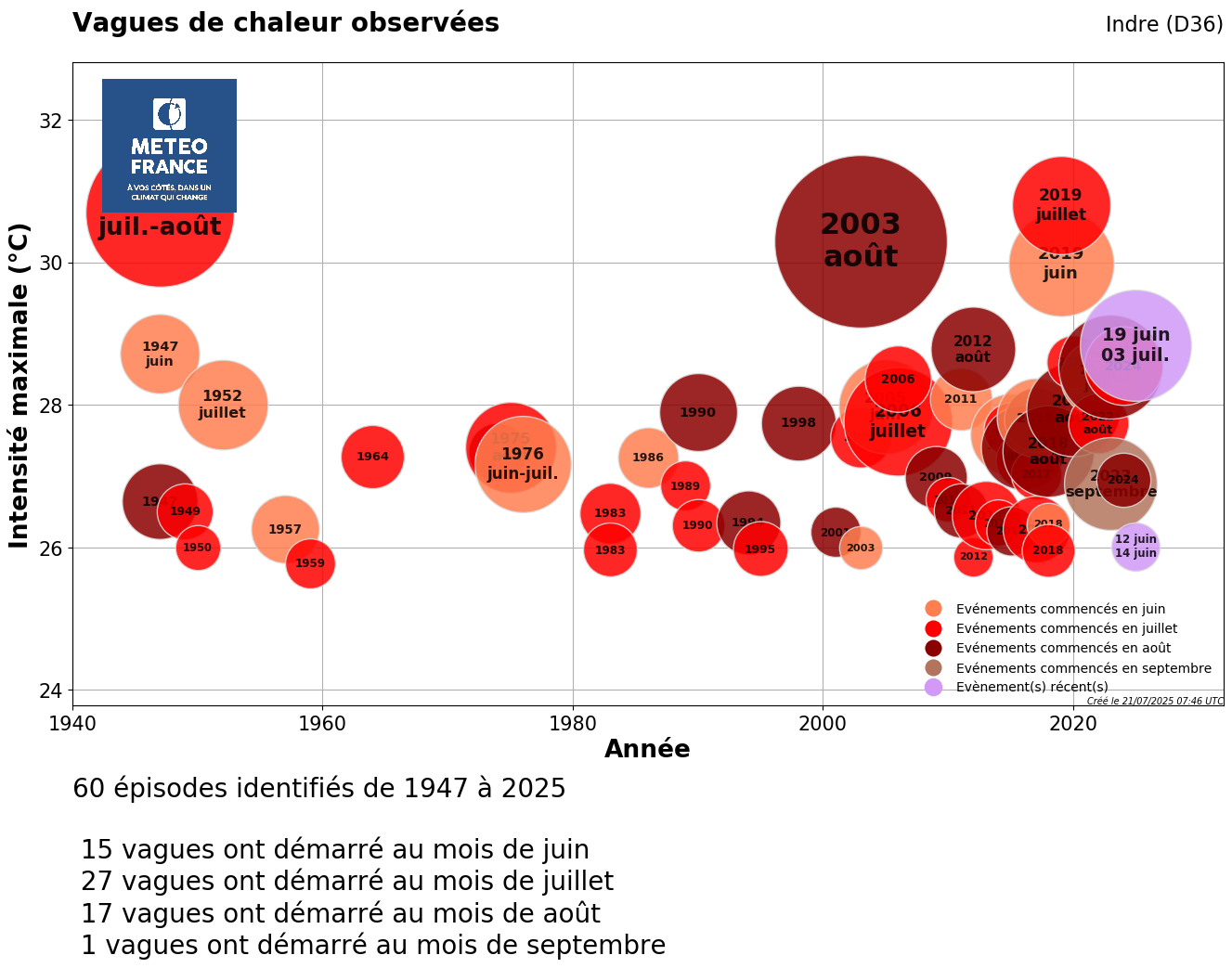 Les vagues de chaleur recensées dans l’Indre depuis 1947 (copyright : Météo France).