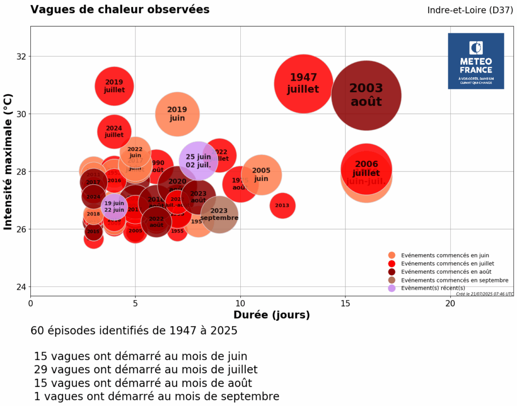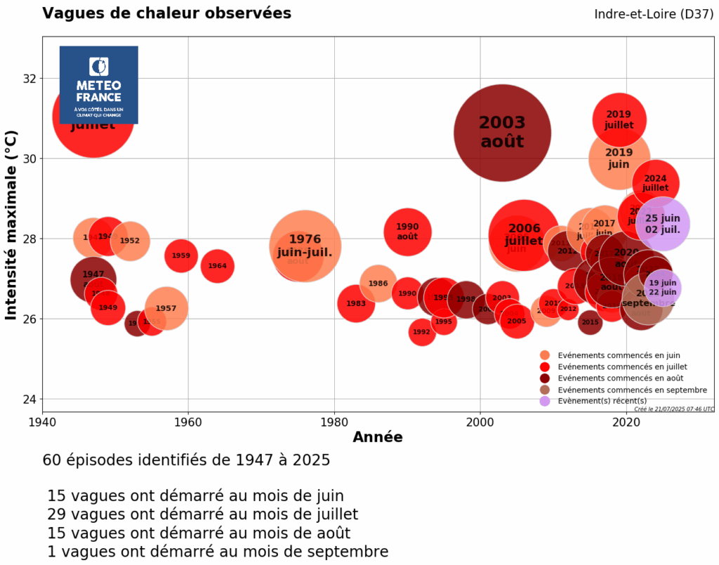 Les vagues de chaleur recensées dans l’Indre-et-Loire depuis 1947 (copyright : Météo France).