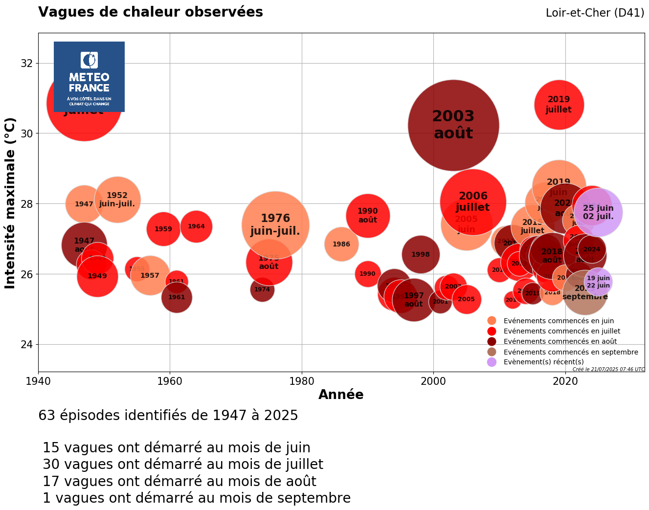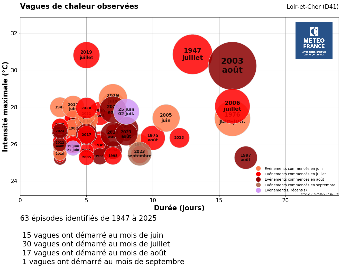 Les vagues de chaleur recensées dans le Loir-et-Cher depuis 1947 (copyright : Météo France).