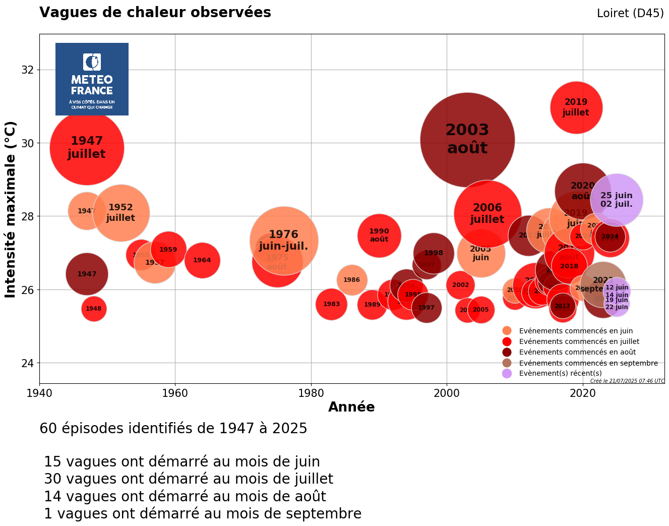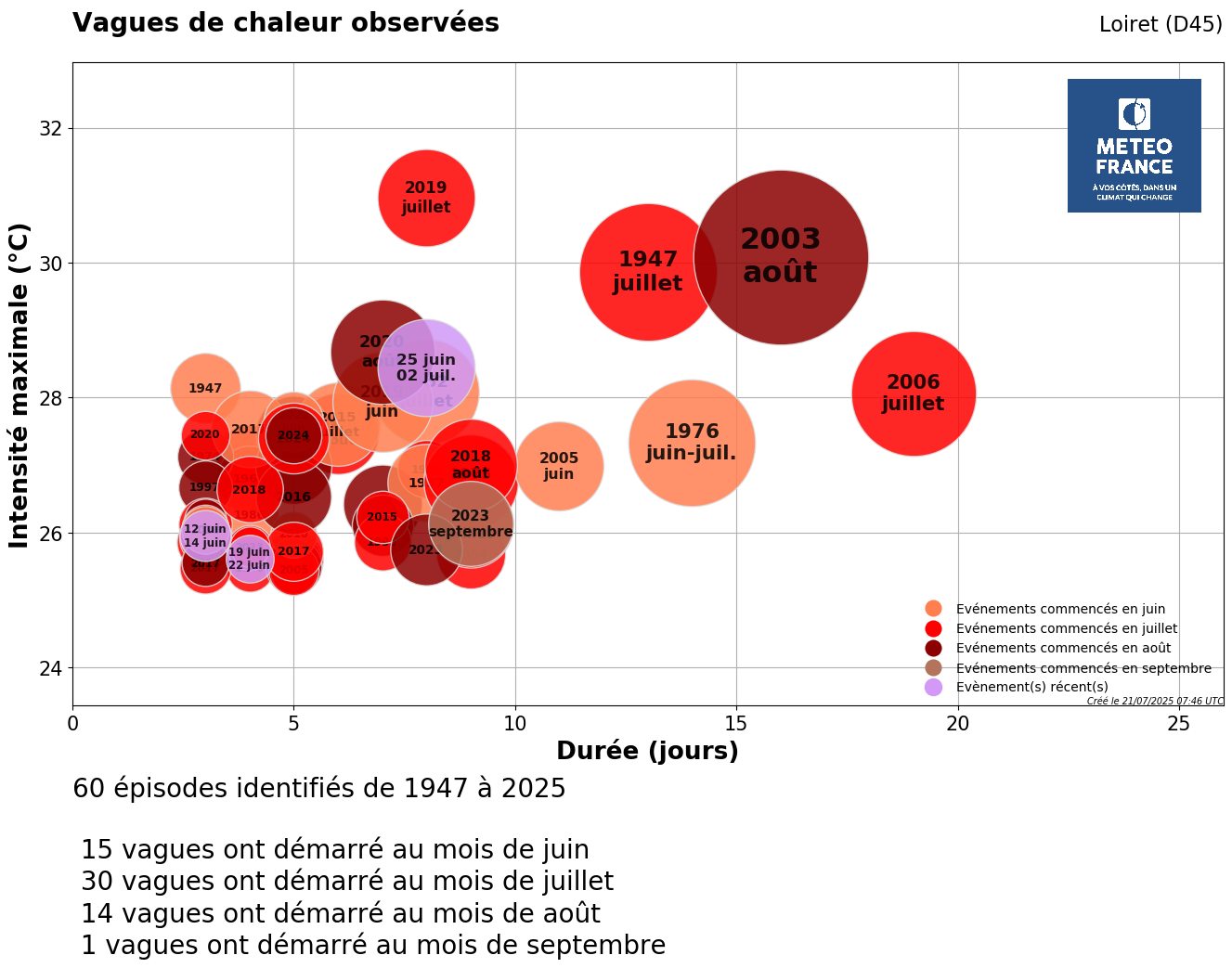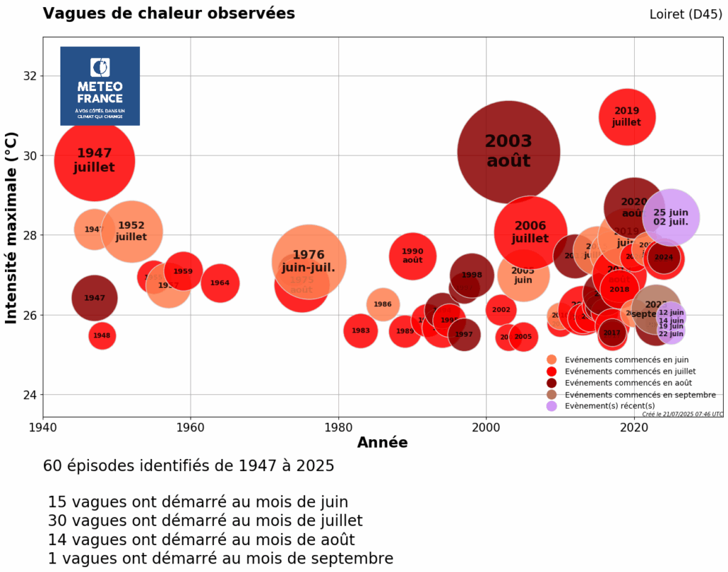 Les vagues de chaleur recensées dans le Loiret depuis 1947 (copyright : Météo France).
