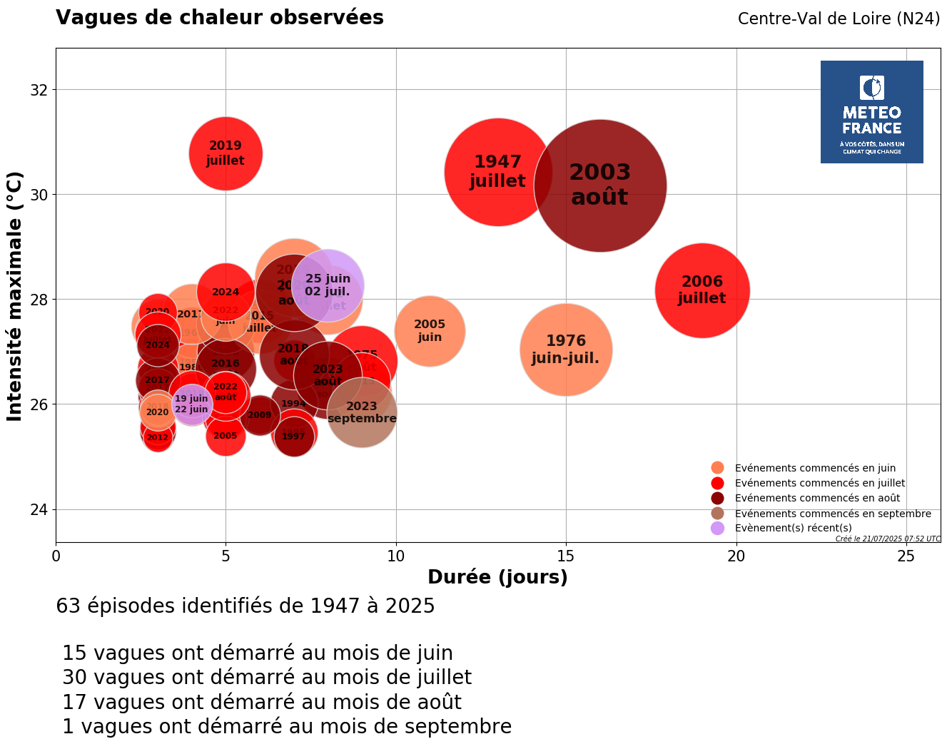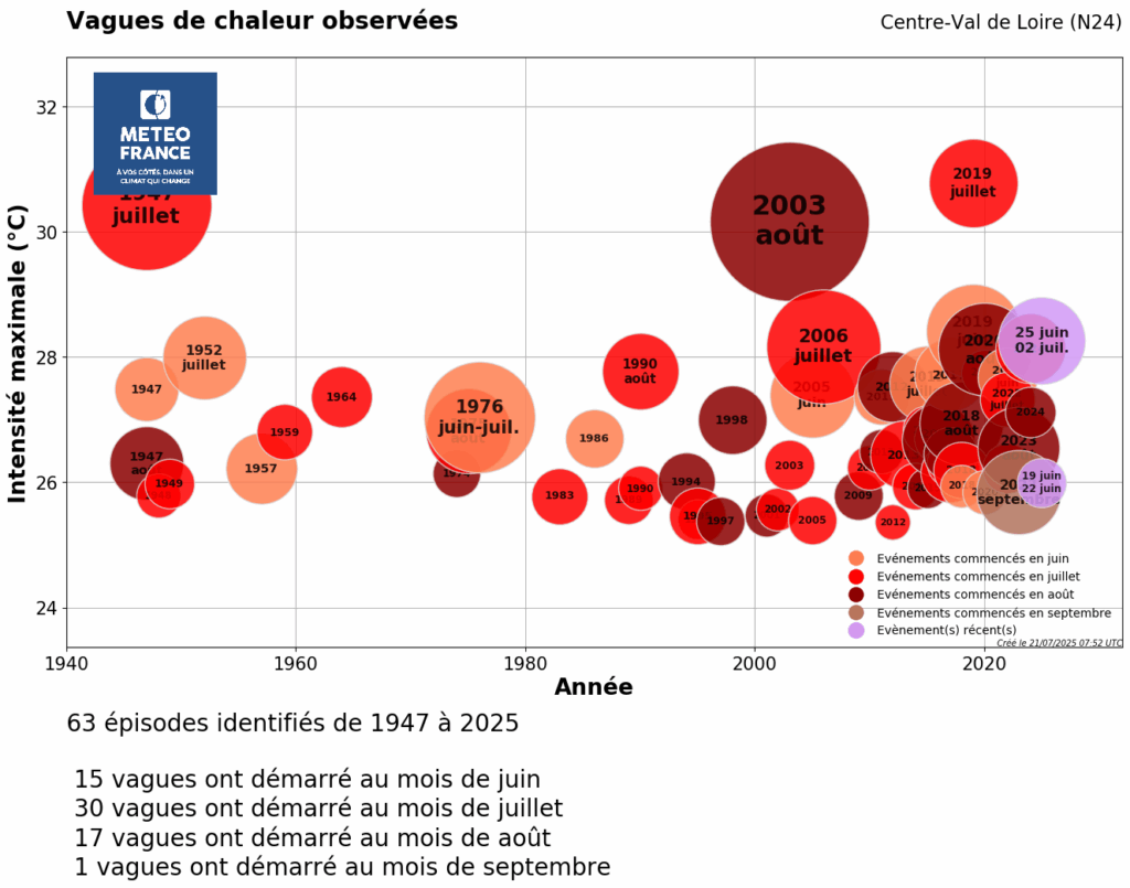 Les vagues de chaleur recensées dans le Centre – Val de Loire depuis 1947 (copyright : Météo France).