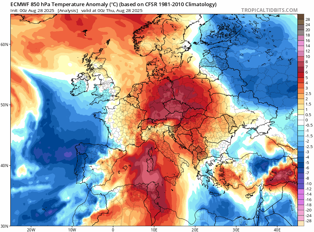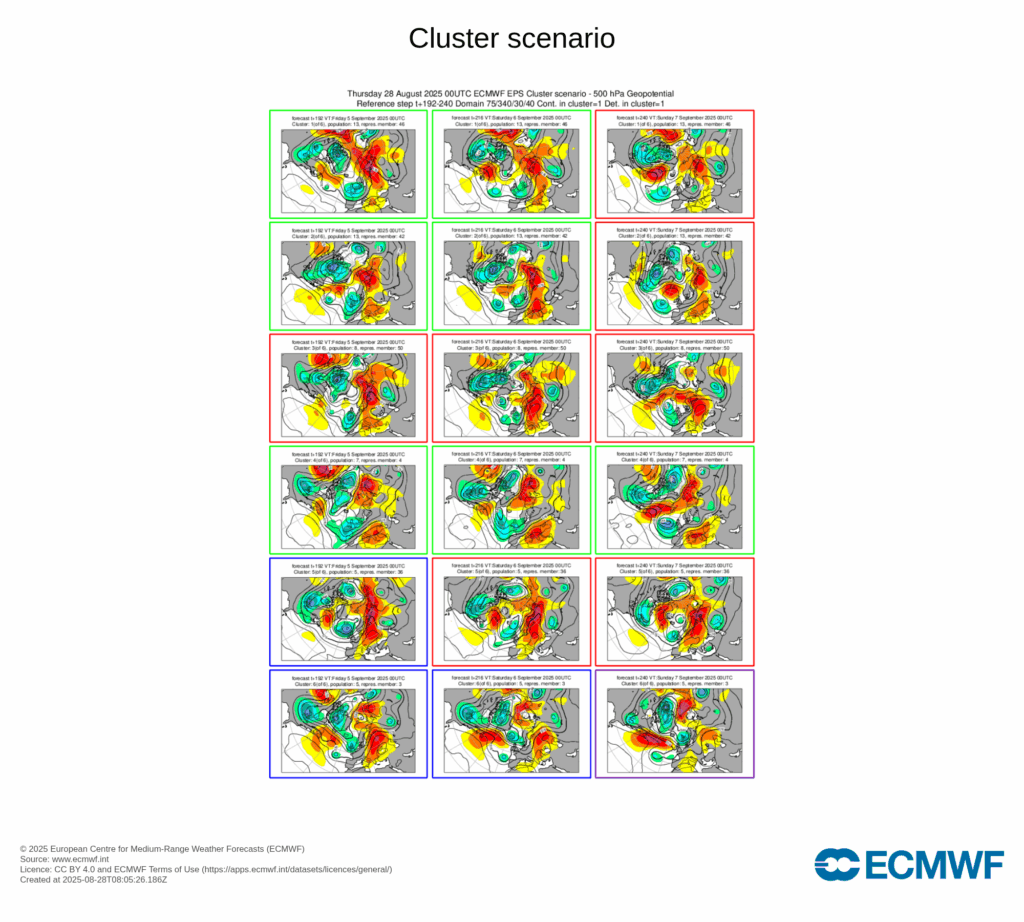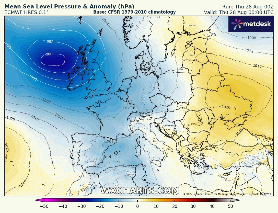 Cette fin d’été 2025 se terminera dans une atmosphère agitée en France ! Un véritable flux océanique perturbé dynamique s’installera sur l’Europe. L’animation ci-dessous montre bien les fréquentes anomalies dépressionnaires circulant à proximité du pays jusqu’à début septembre…
