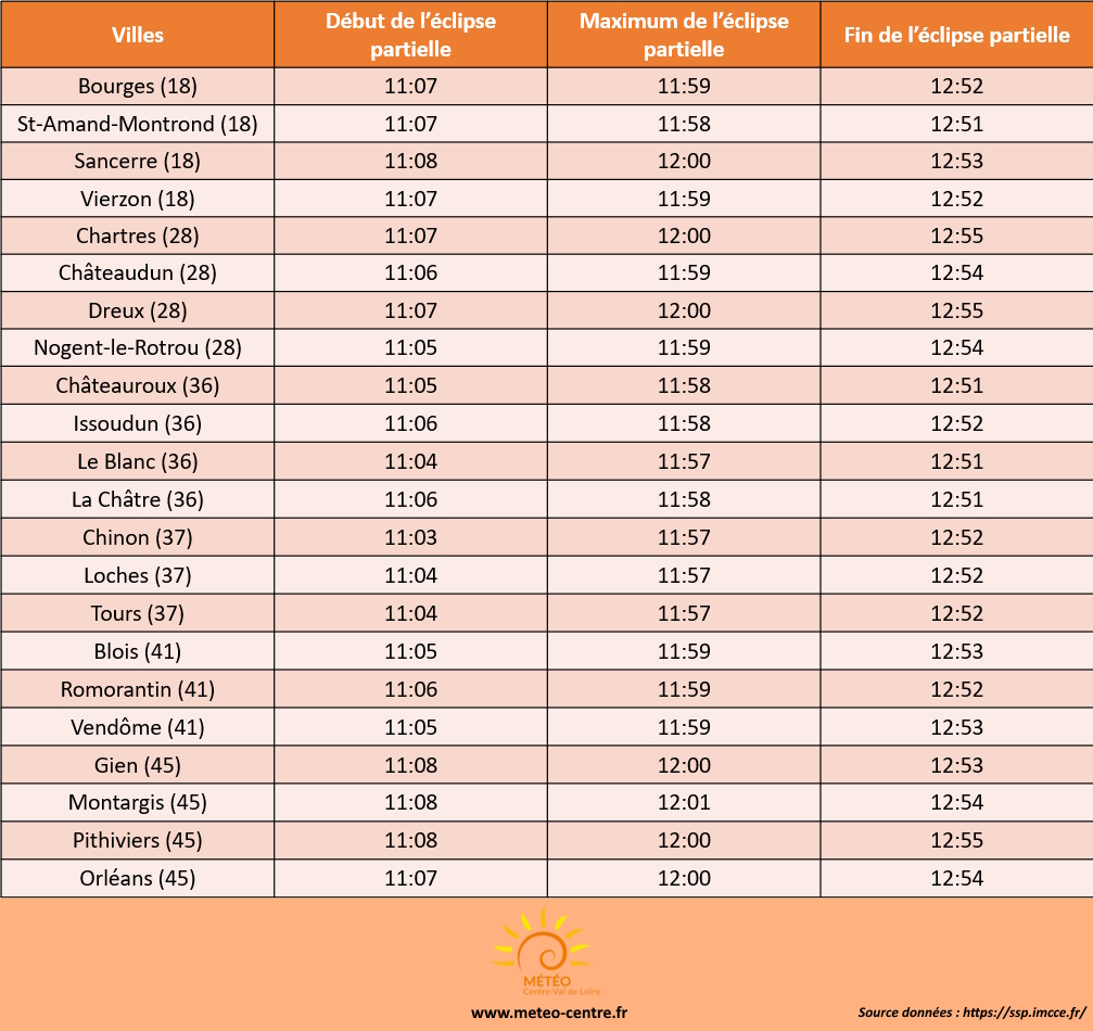 Cette éclipse partielle se déroulera à la mi-journée de ce samedi 29 mars 2025 (d’environ 11h à 12h55), au moment où le soleil sera quasiment au plus haut dans notre ciel. Le tableau ci-dessous présente les différents phases de l’éclipse partielle du Soleil sur notre région Centre-Val de Loire :