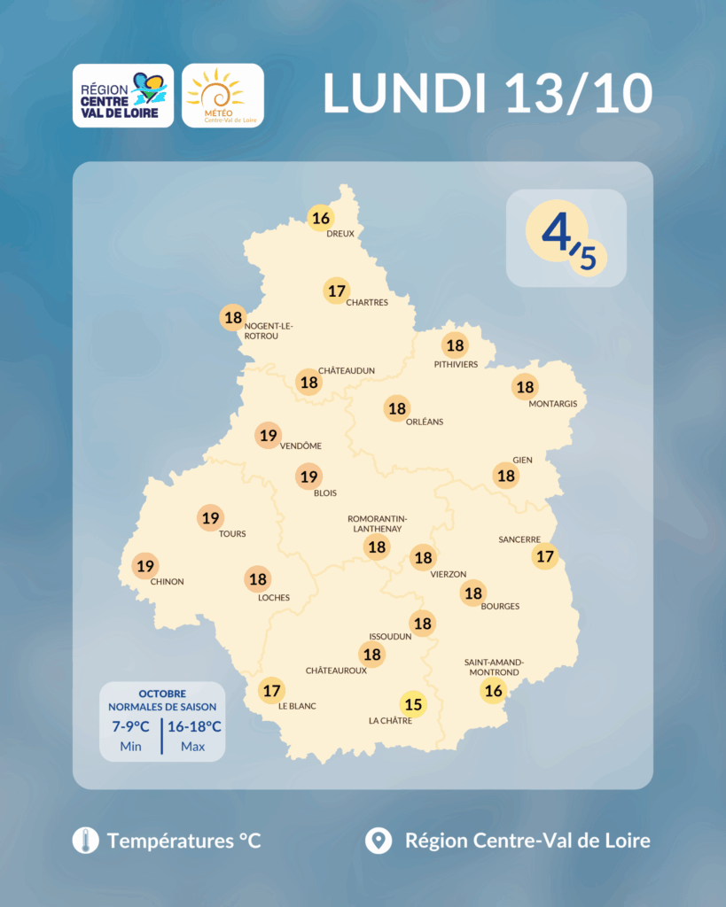 - Températures maximales : 13 à 20°C. Possiblement que 11-13°C sous les éventuels nuages bas tenaces (Sud Berry et Nord Eurélien).