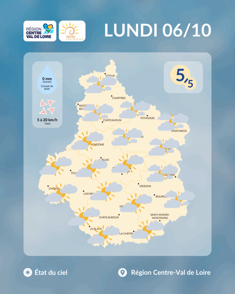 Etat du ciel en région Centre – Val de Loire prévu dans l’après-midi de ce lundi 6 octobre 2025 (copyright : Association Météo Centre – Val de Loire).