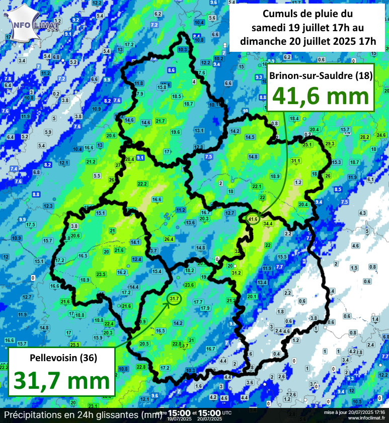 Au cours de cette journée du dimanche 20 juillet 2025, une dégradation pluvio-orageuse a concerné une large partie de notre région Centre – Val de Loire. Des orages ont touché un axe sud-ouest – nord-est en partant du Blanc (36) et en allant vers Montargis (45) en traversant la Sologne. Les cumuls de pluie sont assez hétérogènes dans l’ensemble.