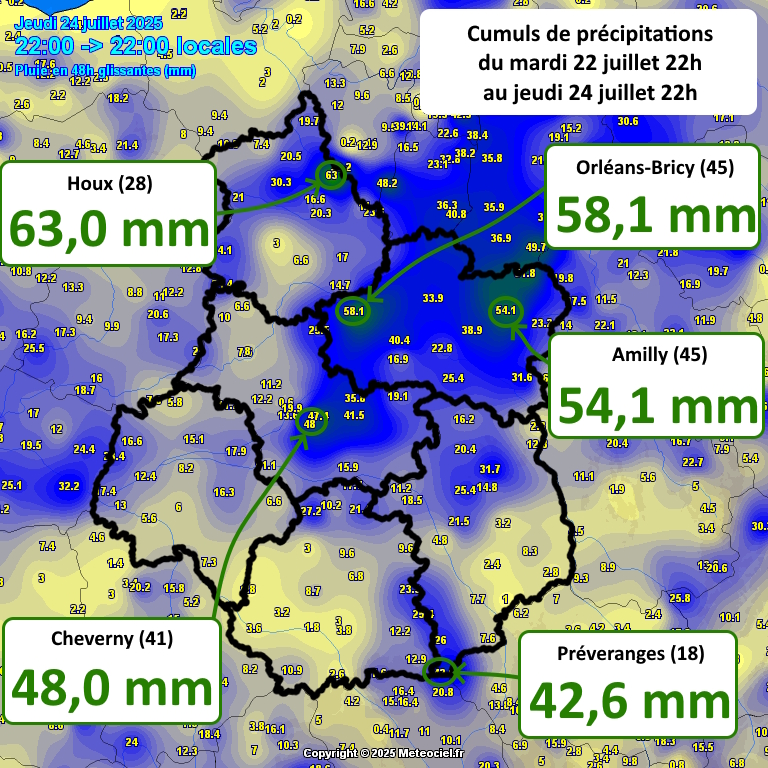 Au cours des journées du mercredi 23 et du jeudi 24 juillet 2025, une dégradation pluvio-orageuse a concerné notre région Centre – Val de Loire. Les cumuls de pluie sont très hétérogènes dans l’ensemble.
