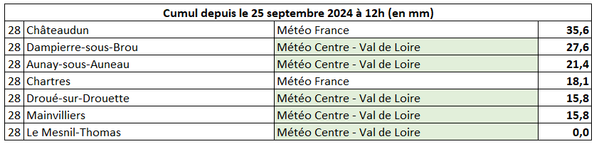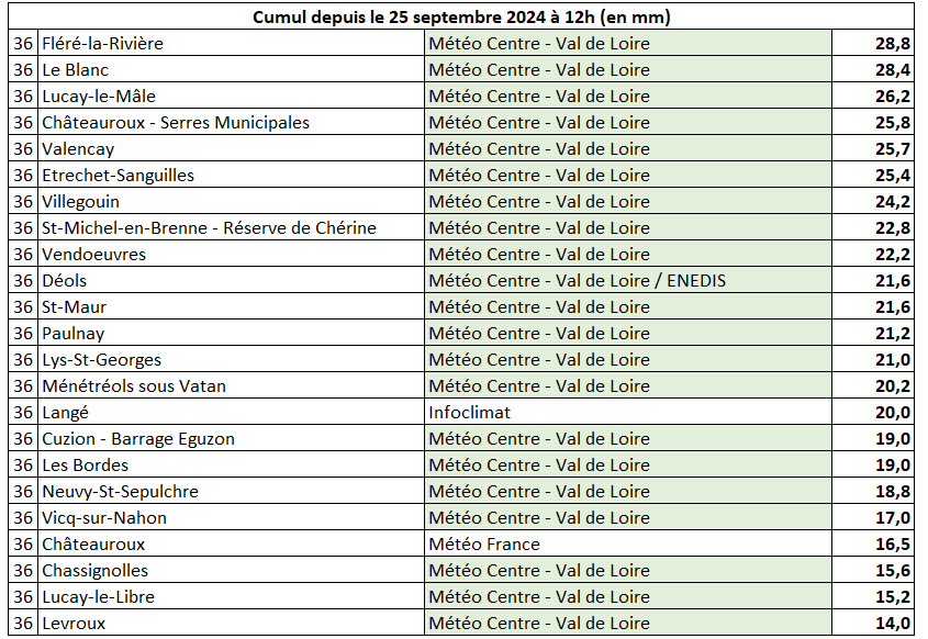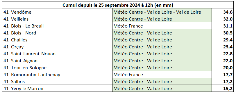 Voici un premier bilan de ces cumuls de précipitations depuis hier 12h jusqu’à ce jeudi 14h… pour les départements du Cher (18), de l’Eure-et-Loir (28), de l’Indre (36), de l’Indre-et-Loire (37), du Loir-et-Cher (41) et du Loiret (45) :