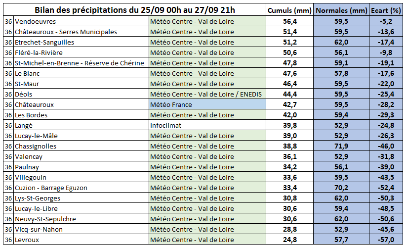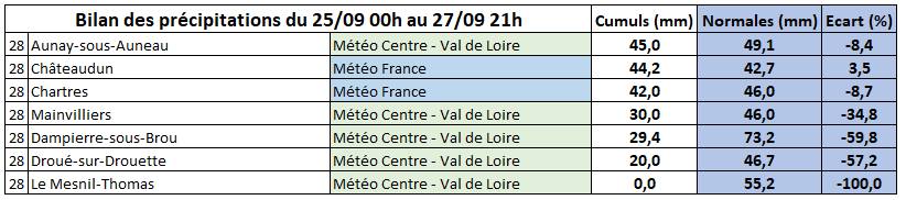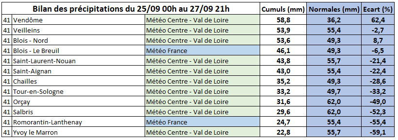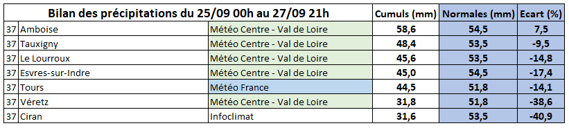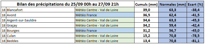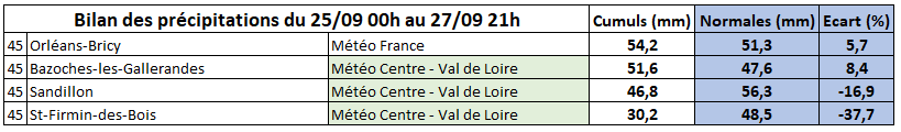 [BILAN] CUMULS DES PLUIES DU 25 AU 27 SEPTEMBRE 2024 – RÉGION CVDL