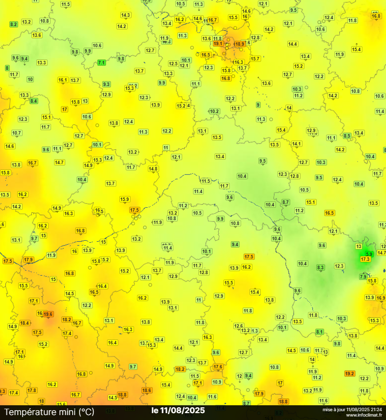 Comme on peut le voir sur les relevés et la carte les accompagnant, les communes concernées par une nouvelle nuit tropicale sont localisées au sud de la région (Sud de l’Indre-et-Loire, Indre et Cher). On relève jusqu’à plus de 21°C localement au plus « frais » de la nuit dans le Berry. A contrario, dans l’Eure-et-Loir, on trouve des valeurs inférieures à 15°C, voir moins localement.