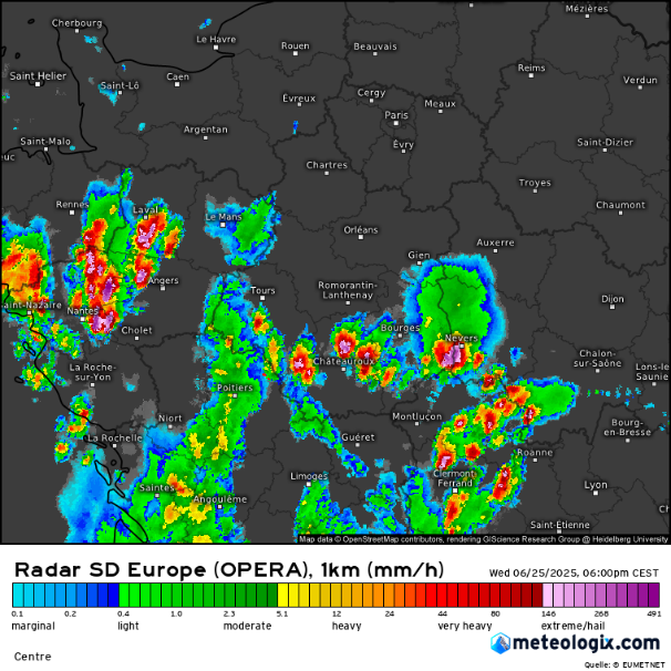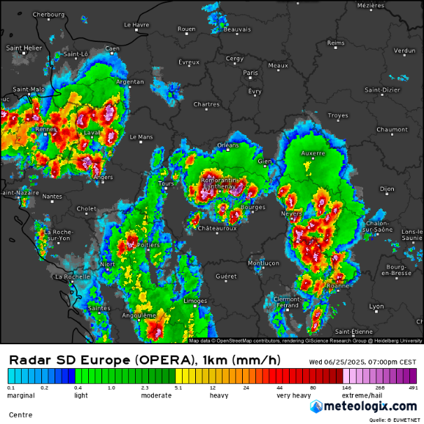 La zone orageuse centrale, très structurée et compacte, couvre une partie importante du Centre – Val de Loire, dont le Loir-et-Cher, avec un noyau convectif particulièrement actif qui semble centré sur l’axe Bretagne > Pays de la Loire > Centre.