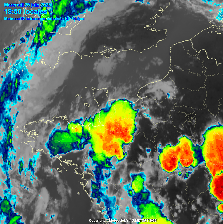 Figure 7 : Image satellite fournie, prise par Meteosat12 (MTG – satellite de troisième génération) le 25 juin 2025 à 18h50 locales, en infrarouge colorisé (canal 10.5 µm, haute résolution), https://www.meteociel.com