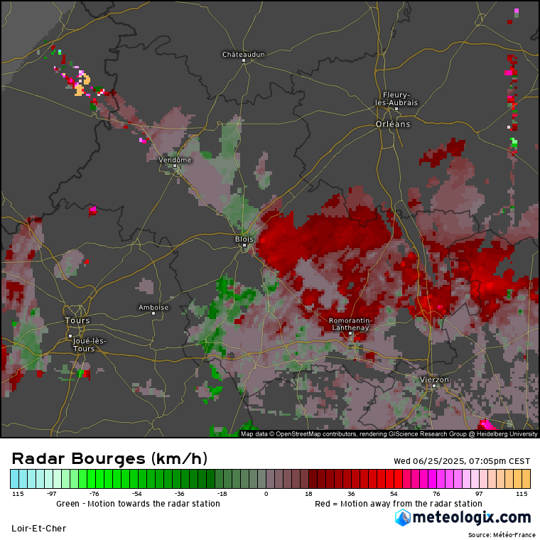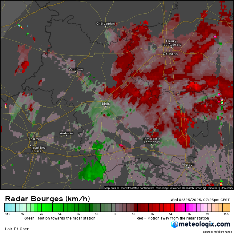 Sur l’image suivante (19h25 CEST), ce motif s’accentue, un noyau de vent descendant intense (taches vertes foncées voire cyan, soit des vitesses dépassant localement les –76 km/h vers le radar) apparaît au sud de Blois, accompagné immédiatement au nord et à l’est de taches rouges intenses. Cela confirme la divergence locale, renforcée dans le temps, signe que la rafale descendante a atteint son pic de puissance.