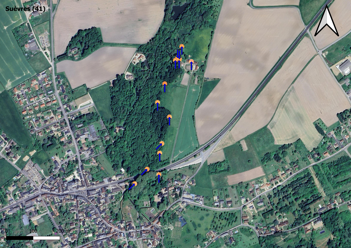 Une cartographie ci-dessous figure 10 précise l’axe des dégâts sur la commune de Suèvres (flèches en bleues), en surface, notamment grâce à des repérages GPS ou images drone si disponibles, permettant de visualiser la trajectoire probable du phénomène venteux.