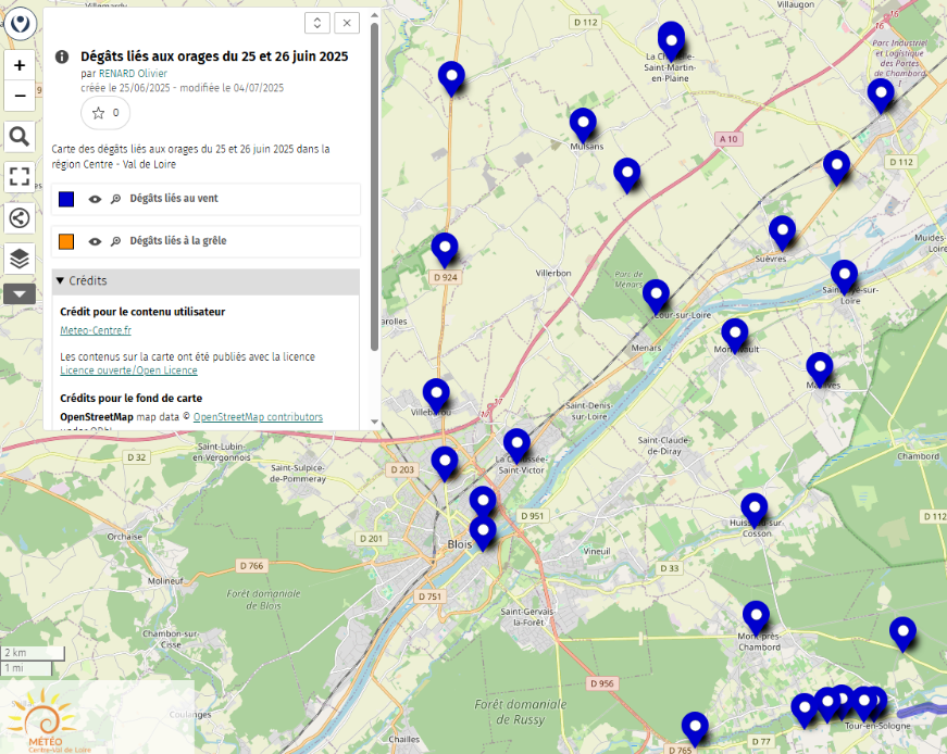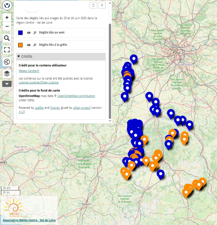La carte de recensement des dégâts ci-dessous, figures 11 et 12, permet de visualiser les impacts des orages du 25 et 26 juin 2025 dans la région Centre-Val de Loire. Les points bleus indiquent les dégâts liés au vent, tandis que les points orange représentent les dégâts causés par la grêle.