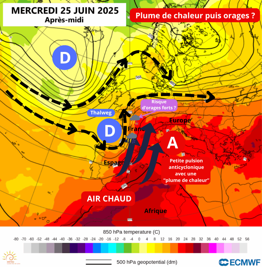 Figure 1 : Géopotentiels à 500 hPa (soit environ 5500 m d’altitude) et températures vers 850 hPa prévus pour le 25 juin 2025 (soit environ vers 1500m d’altitude). Copyright : modèle ECMWF via https://www.ecmwf.int, Carte légendée par l’Association Météo Centre – Val de Loire